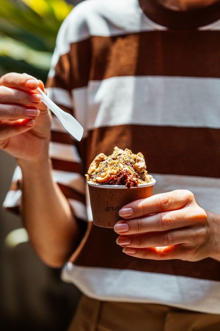Na finalização, os toppings entram para adicionar textura e contraste, como crumble de banana, castanha-de-caju caramelizada, nibs de cacau, flor de sal, cupuaçu glaceado e crocante de tapioca. As caldas de chocolate, caramelo de cacau e caramelo de café completam a experiência.