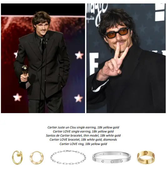 A noite do Critics marcou a vitória do ator e embaixador da maison, Jacob Elordi, que recebeu o prêmio de Melhor Ator Coadjuvante em Filme por “Frankenstein”. Para a ocasião, ele escolheu uma composição sofisticada de joias Cartier, incluindo os brincos únicos Juste un Clou e LOVE de ouro amarelo, a pulseira Santos de Cartier, modelo fino, de ouro branco, a pulseira LOVE de ouro branco com diamantes e o anel LOVE de ouro amarelo.