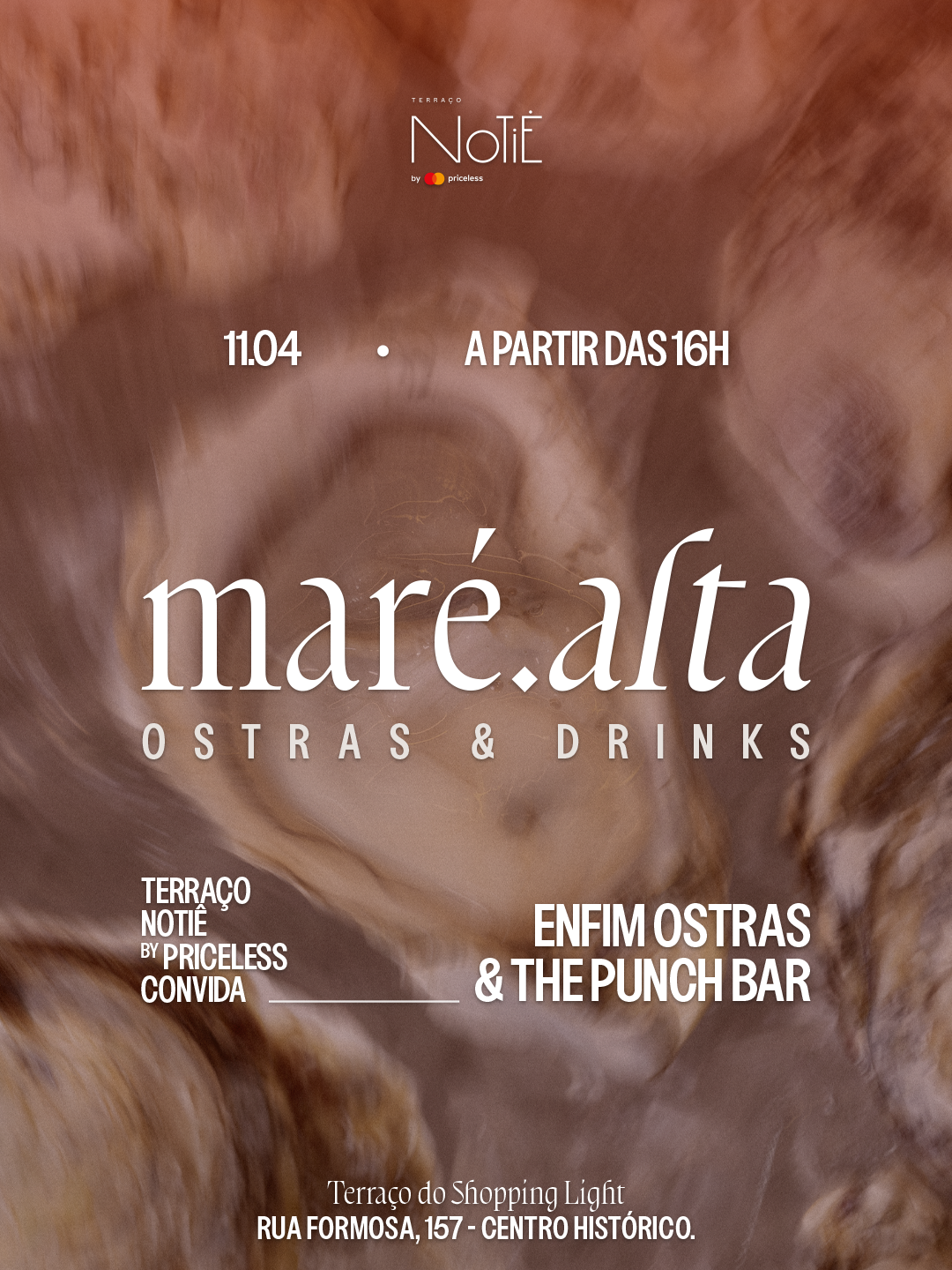 Para criar momentos ainda mais memoráveis aos seus clientes, o Terraço Notiê by Priceless apresenta a Maré Alta, uma experiência exclusiva em parceria com a marca Enfim Ostras. O momento será realizado em duas datas, nos dias 11 e 26 de abril, a partir das 16h, unindo o frescor do final da tarde ao sabor delicado da iguaria, a sofisticação da carta de drinks especiais e a vista icônica do centro de São Paulo.