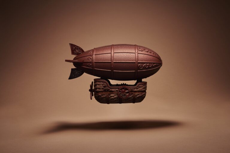 • O balão: inteiramente confeccionado em chocolate, revela no interior de sua casca um praliné de amêndoas com baunilha torrada — intenso e envolvente — evocando o sopro do motor a vapor que impulsiona o dirigível.