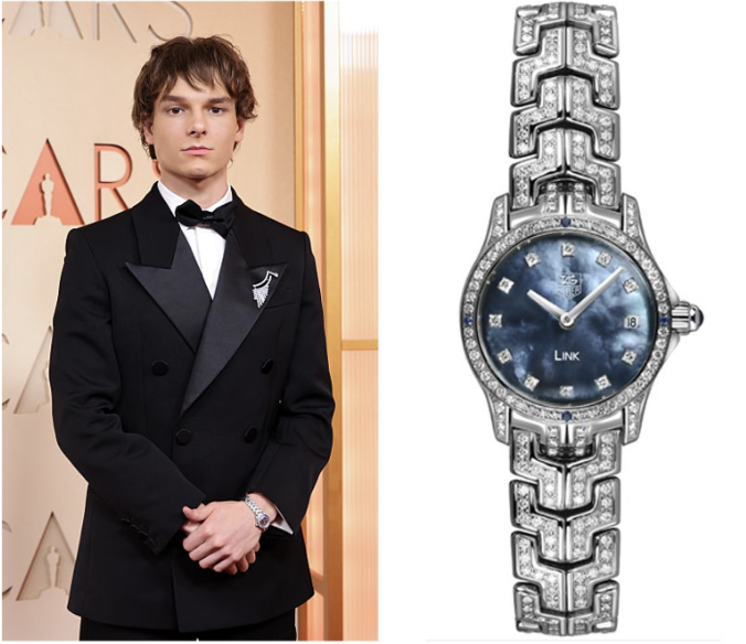 Um dos grandes destaques da TAG Heuer no Oscar 2026 foi a escolha por modelos históricos. O jovem ator Mason Thames cruzou o tapete vermelho principal usando o Vintage Link Quartz River of Diamonds de 24mm, uma peça que une sofisticação e brilho.