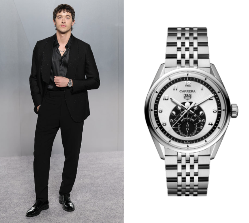 A inovação também teve seu espaço com a TAG Heuer no Oscar 2026. Tom Blyth optou pelo sofisticado TAG Heuer Carrera Astronomer de 39mm, um modelo que combina complicações técnicas com um visual moderno.