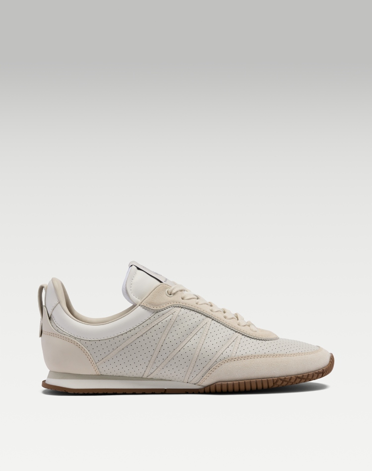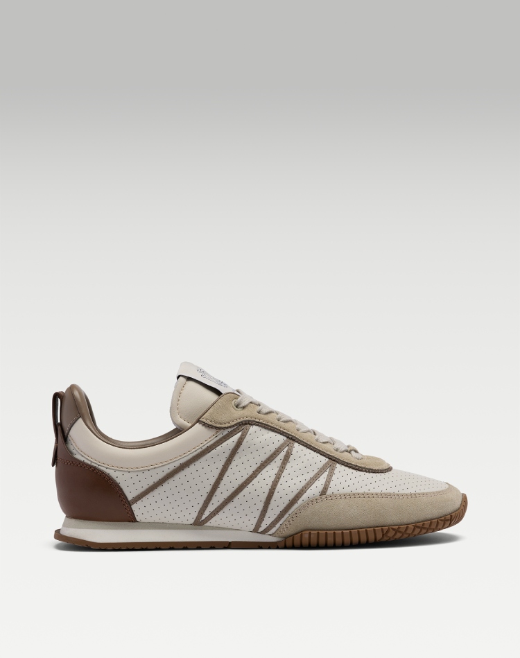 Para os entusiastas da nostalgia de alto desempenho, o novo dunhillian Runner resgata a estética das corridas do final do século XX, reinterpretada sob a lente da sofisticação londrina. O modelo combina couro napa perfurado com camurça em contraste, criando uma textura rica e visualmente densa.