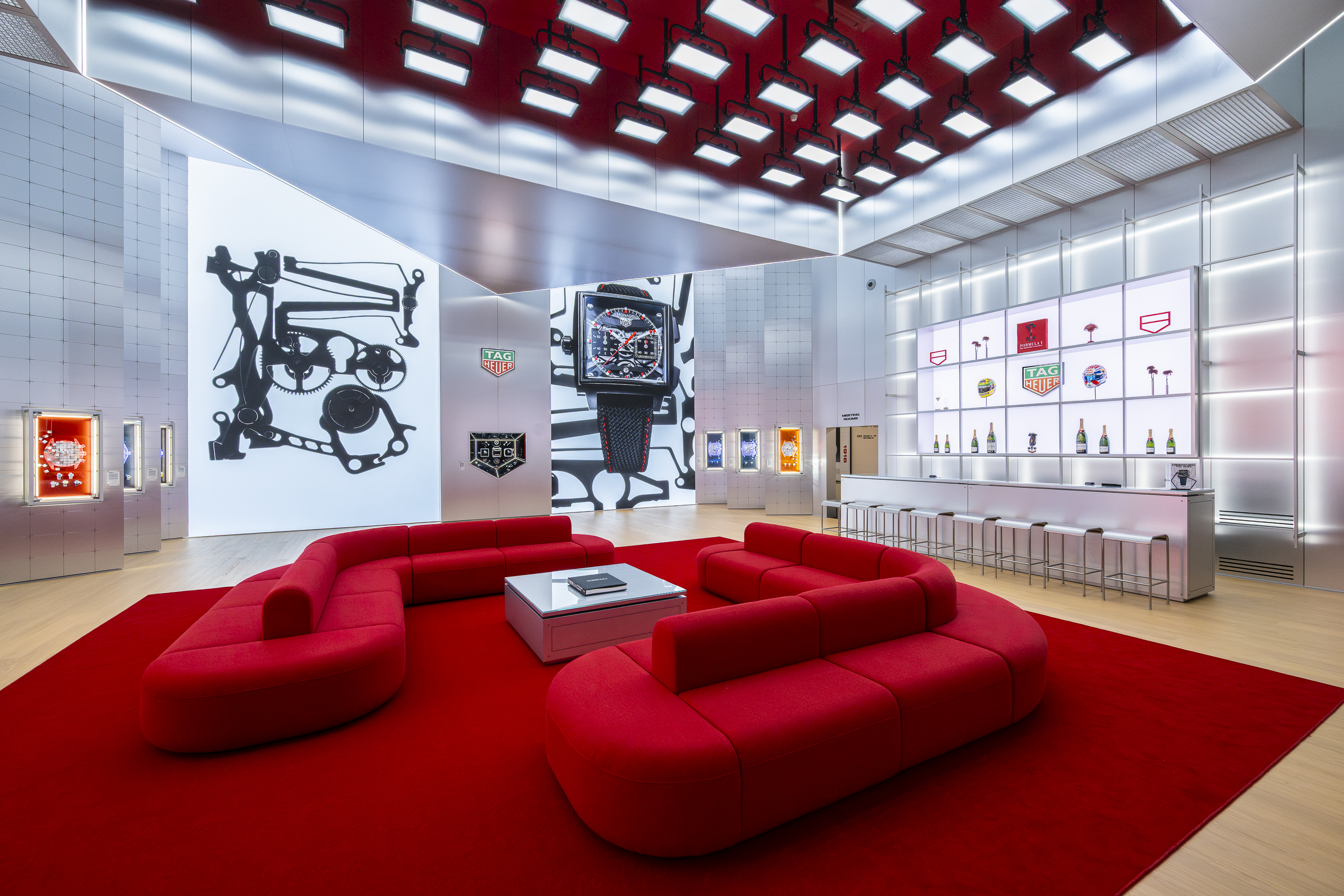 O espaço da TAG Heuer ocupa 1.000 metros quadrados dentro do universo LVMH. Embora mantenha uma estrutura arquitetônica imediatamente reconhecível, a cenografia foi completamente reinventada para destacar as mais recentes inovações da marca e o legado duradouro do TAG Heuer Monaco.