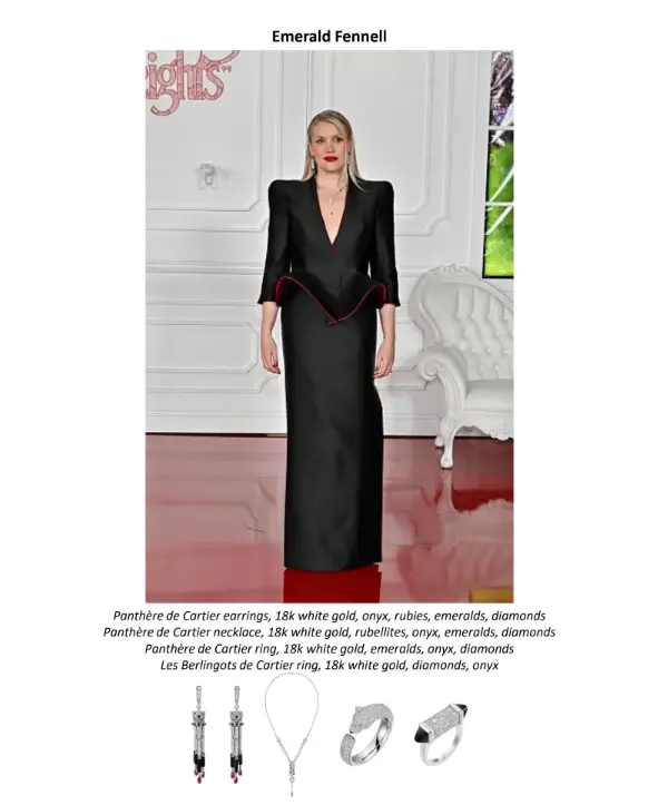 Já a diretora Emerald Fennell brilhou com peças icônicas da marca, apostando em joias da coleção Panthère de Cartier: brincos em ouro branco 18 quilates com ônix, rubis, esmeraldas e diamantes, além do colar Panthère em ouro branco com rubelitas, ônix, esmeraldas e diamantes. Ela completou a produção com o anel Panthère de Cartier, em ouro branco com esmeraldas, ônix e diamantes, e o anel Les Berlingots de Cartier, em ouro branco com diamantes e ônix.