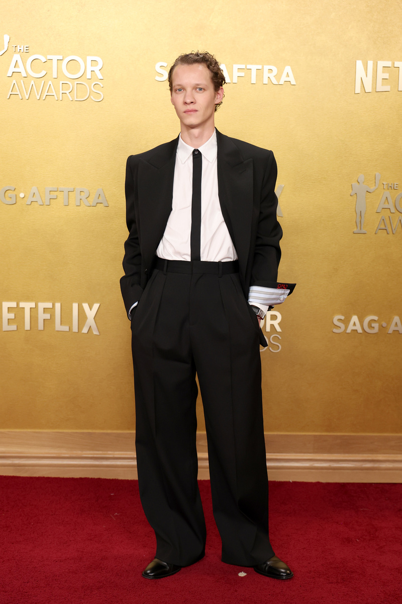 A colaboração entre Ruaridh Mollica, Felix Kammerer e o uso da LOEWE também revelou inovações estéticas curiosas. Felix Kammerer, assessorado pelo stylist Davey Sutton, vestiu um paletó com manga dupla de camisa e uma peça com carcela de gravata em trompe-l’œil (ilusão de ótica). A calça de perna ampla completou o visual vanguardista, reforçando a parceria bem-sucedida entre os atores e a marca.