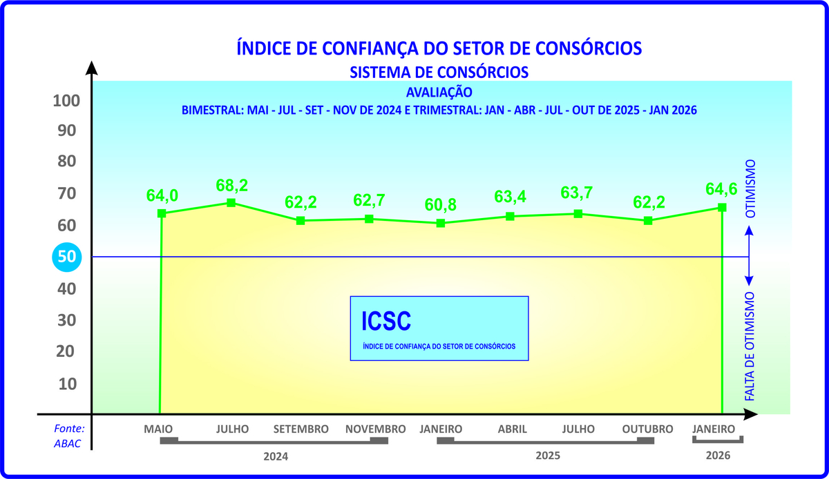 O recente cálculo, sempre baseado em respostas recebidas, continua sinalizando boas perspectivas para o mecanismo também em 2026. Ao considerar percepções dos agentes dos mais diversos setores econômicos, consumidores e participantes do sistema de consórcios, o nível de confiança das administradoras associadas da entidade permanece otimista.