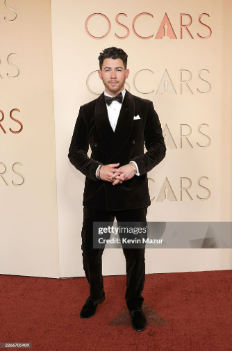 Um dos grandes destaques da Ralph Lauren no Oscar 2026 foi o visual de Nick Jonas. O artista usou um smoking Purple Label feito sob medida, apresentando um paletó de veludo marrom trespassado que fugiu do óbvio com extrema classe. O conjunto foi finalizado com calça de alfaiataria, camisa de smoking plissada e uma gravata-borboleta de cetim, mantendo a harmonia cromática com slippers de veludo marrom. Essa escolha reforça a tendência de tons terrosos e tecidos táteis para eventos de gala em 2026.