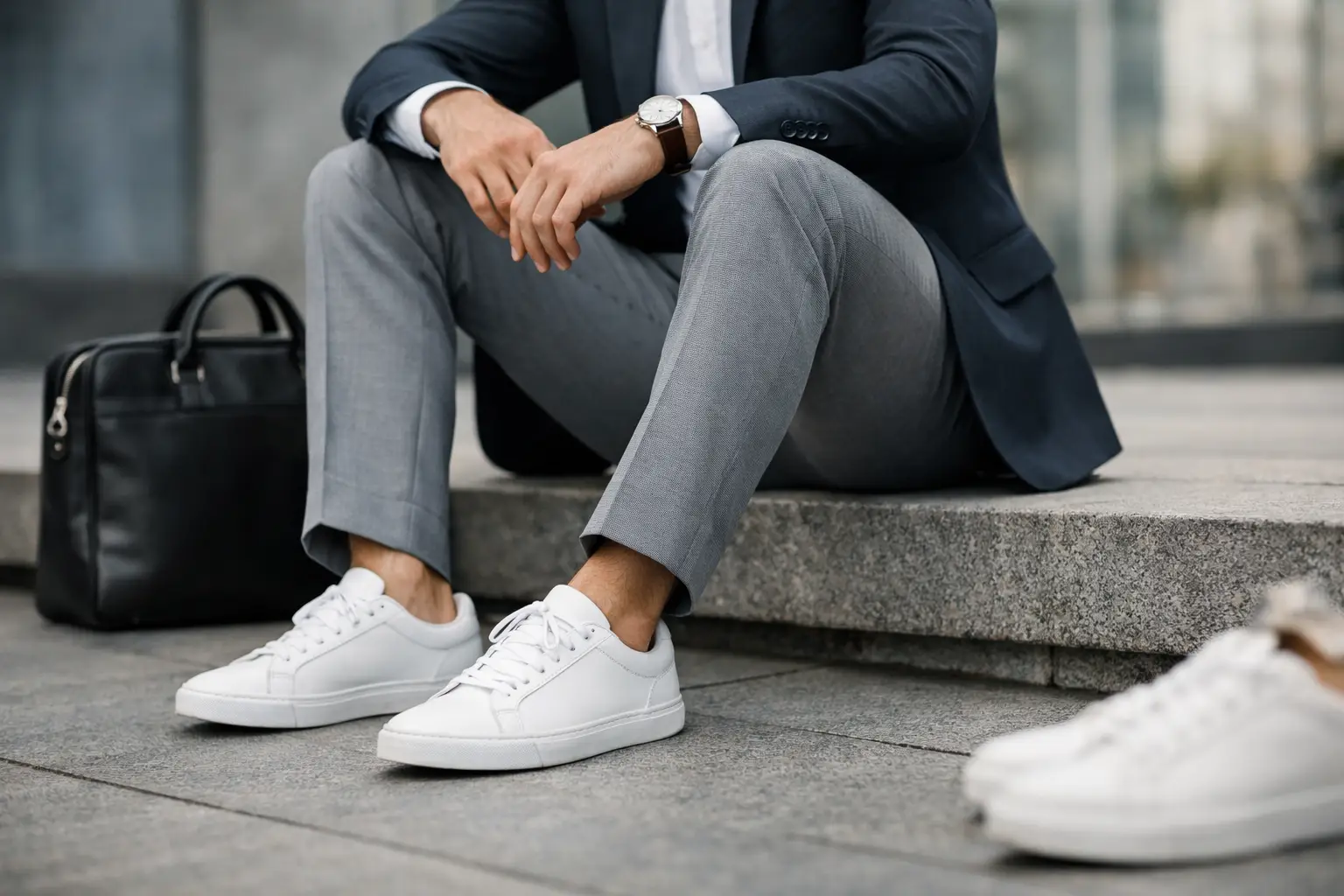 Com terno completo, o melhor caminho costuma ser um tênis de couro liso em branco, off-white ou preto, sem elementos esportivos marcantes. É a combinação certa para eventos criativos, viagens de trabalho, almoços executivos menos formais e ocasiões em que você quer passar autoridade com frescor.